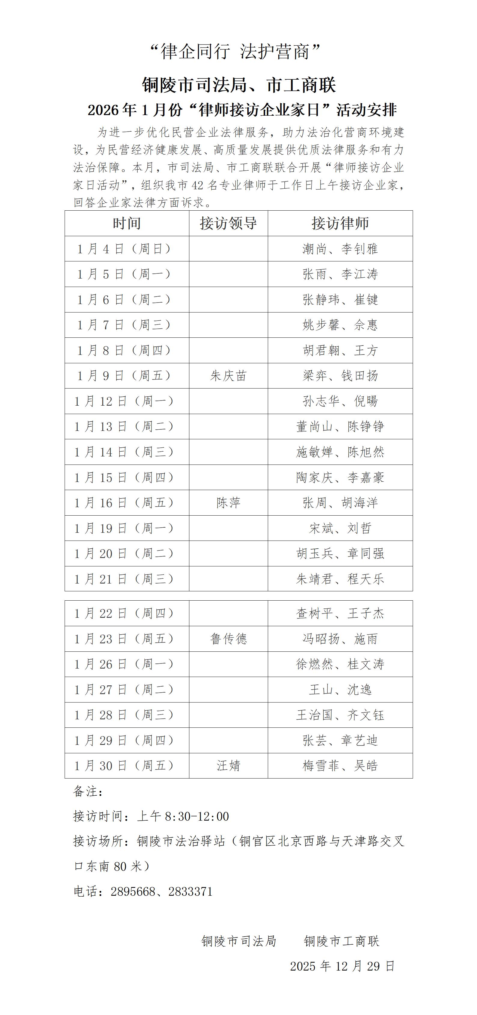 铜陵市司法局、市工商联2026年1月份“律师接访企业家日”活动安排